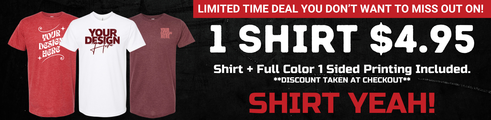 CREATE YOUR FIRST SHIRT WITH UNLIMITED INK COLORS ON ONE SIDE FOR $4.95, INCLUDING SHIRT AND PRINTING.